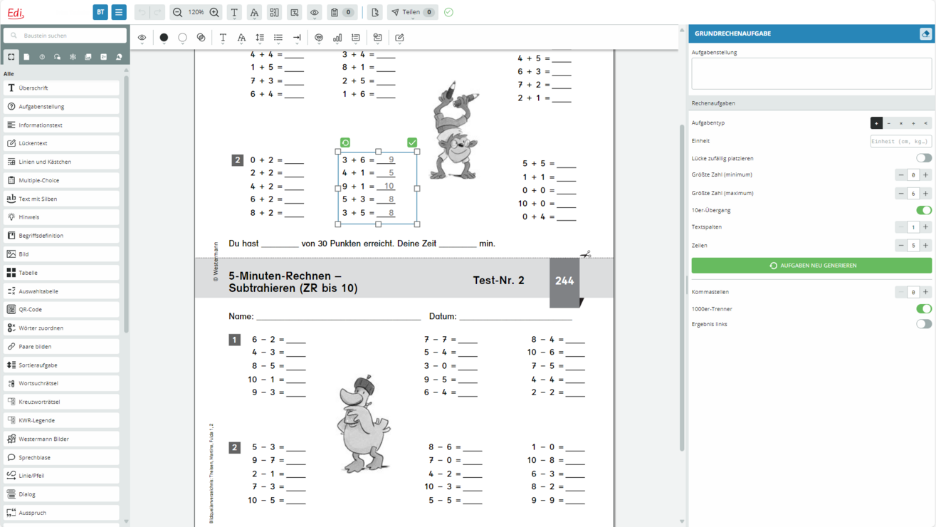 In Edi wechseln Sie komfortabel zwischen Arbeitsblatt- und Lösungsansicht. Einige Mathematik-Bausteine bieten sogar die Möglichkeit, Lösungen automatisch zu erzeugen.