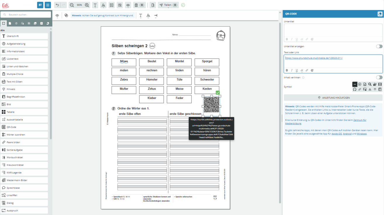 Ergänzen Sie Arbeitsblätter ganz einfach mit digitalen Inhalten. Dazu nutzen Sie den integrierten QR-Code-Generator und platzieren den QR-Code an einer beliebigen Stelle am Arbeitsblatt. Die Handhabung in Edi ist einfach und sicher.